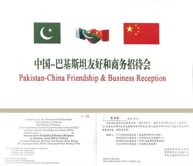202466日,由巴基斯坦駐華使館、中國國際文化傳播中心和中國巴基斯坦友好協(xié)會(huì )共同主辦的中國巴基斯坦友好和商務(wù)招待會(huì )在京舉辦。正在中國訪(fǎng)問(wèn)的巴基斯坦總理夏巴茲·謝里夫出席招待會(huì )并致辭。前聯(lián)合國副秘書(shū)長(cháng)沙祖康、中國人民對外友好協(xié)會(huì )副會(huì )長(cháng)李???、中國國際文化傳播中心執行主席龍宇翔,巴基斯坦副總理兼外長(cháng)達爾、巴基斯坦駐華大使卡里爾·哈什米出席活動(dòng),安達集團黨委書(shū)記、董事長(cháng)、中國愛(ài)心工作委員會(huì )副主席、中巴協(xié)會(huì )理事崔洪金,安達集團總經(jīng)理崔文連受邀參會(huì )。